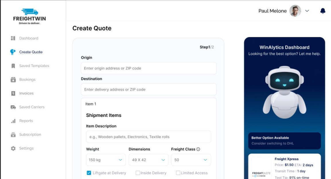 Join the FreightWin Pilot today to be one of the first to streamline LTL shipping and shape our AI Co-Pilot.🚀 Instant quotes from multiple carriers📦 One-click booking and unified tracking🤖 AI features coming soon — help train them